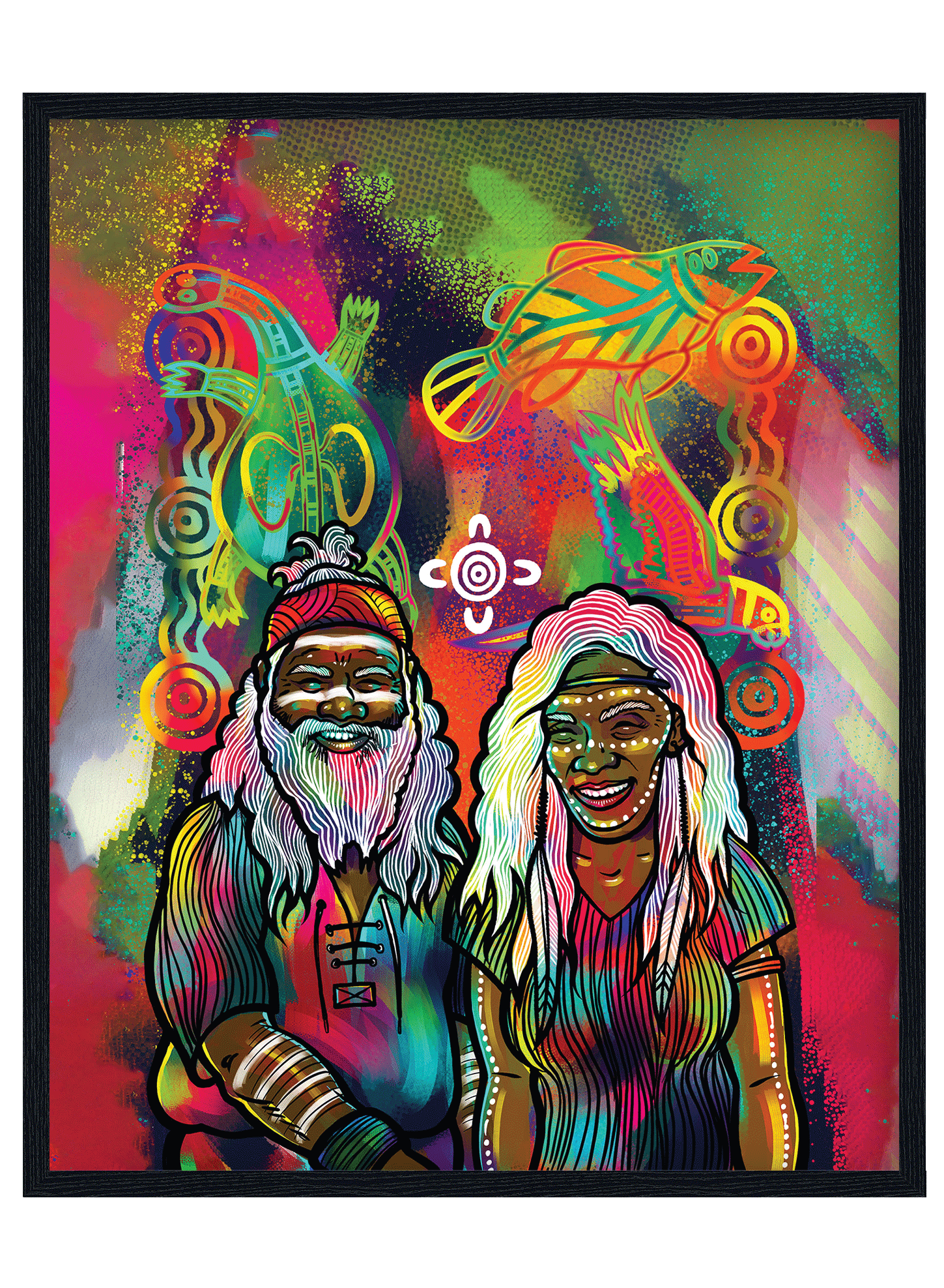 Our Elders have seen a lot of changes in their time but always continue to move forward with a commitment to teaching the traditional ways through art, song, dance and storytelling. This is how each generation builds respect and we become contemporary custodians of culture and identity. All things are connected. Elders create a connection to our history, bringing together Dreaming Stories and Country to preserve culture and wisdom for everyone. The meeting symbol is in the centre of the artwork, showing us coming together, being taught to be strong, overcome adversity, advocate for survival and nurture a sense of appreciation for all those who come before us. The artwork shows the vibrant colour and beauty of our community, through the experience and wisdom of male and female role models who teach us important lessons. Our world is a brighter and richer place when we respect and honour our Elders, brightening the future through cultural knowledge, appreciation and a deep love for one another.