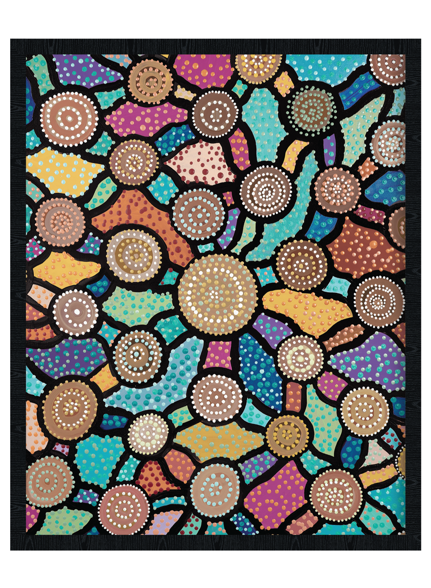This contemporary painting highlights the First Nation People of Australia’s relationship to the land - past, present and future. The circles represent each First Nation group, who we belong to and identify as.