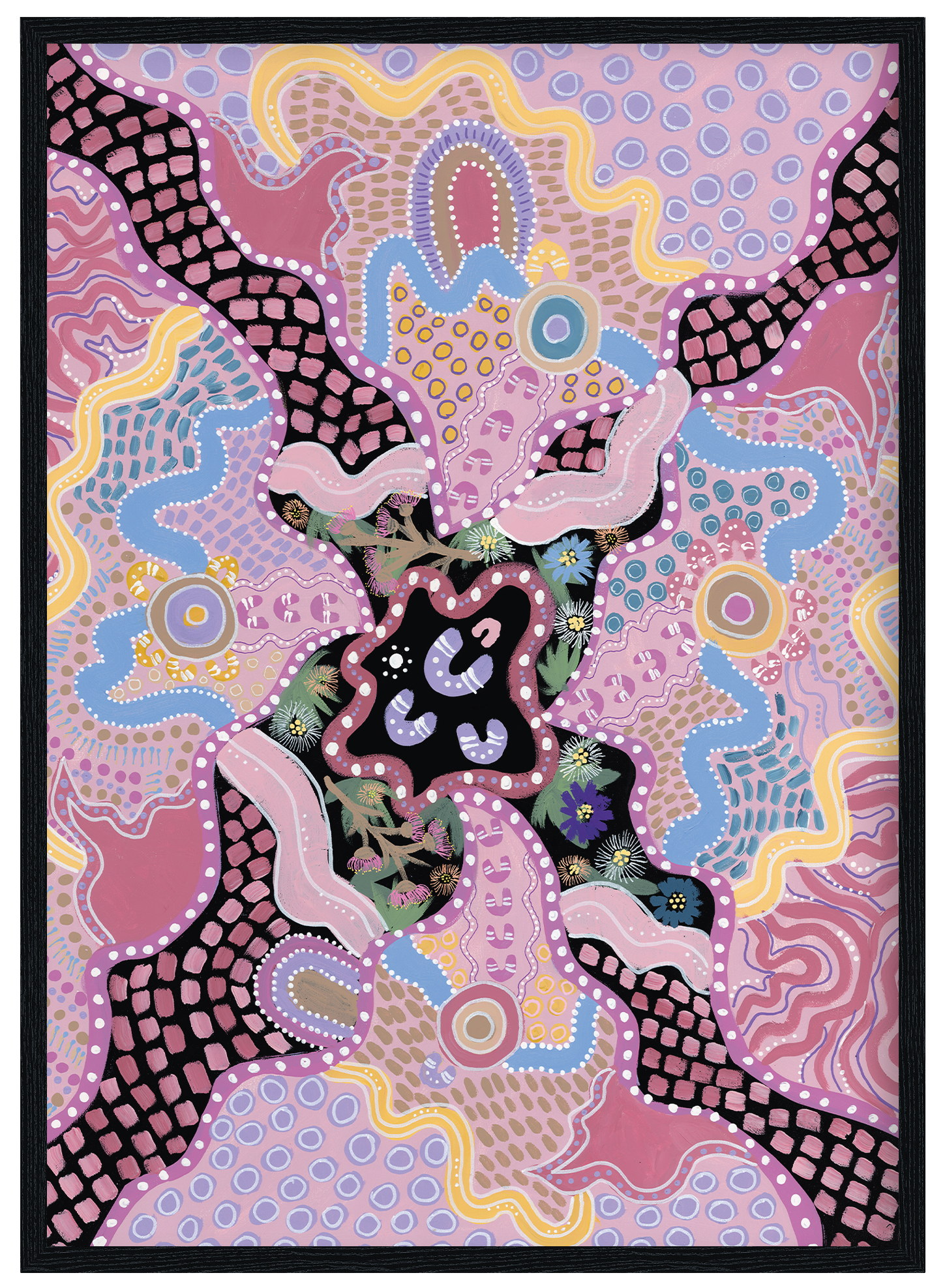 'Guiding Light' is a painting about strength, perseverance and a tribute to the strong community Caitlyn is lucky to be surrounded by. This year's NAIDOC theme of, 'Keep the Fire Burning, Blak, Loud and Proud' is represented throughout this painting. There are four campsites across this painting that each represent a community/place Caity feels or has felt immense strength and pride from. All of these places are connected through a journey line as they are all elements of Caitlyn's life that are connected to each other. Broken Hill and Adelaide are represented at the top and bottom of the canvas. She feels the strength and presence of Broken Hill every time she is with her father and is fortunate and proud to live on Kaurna country. The right campsite represents a previous school community she was a part of and pays respect to the deep connections she built and still has with many of the Aboriginal students and families there. The left campsite is representative of the community Caitlyn has yet to build and is a symbol of what she wants to create with her psychology career in the future. The little person facing Caitlyn, represents her son, Dusty. Within the centre of the painting, you can see four people represented and one star. Caitlyn wanted to pay tribute to three special mentors in her life, who have taught her to always be proud, strong and to remember that our fire was never put out. One of these people is represented through a star as they have passed away but their influence and guidance will always be felt by Caitlyn throughout her life. The river is seen throughout this painting and represents the Barka and the strength and connection Caitlyn feels to it. This painting is a reminder that after everything we have been through, the light and spark within us still shines bright. Caitlyn has been fortunate to learn and grow from leaders who show her their light and fire in everything they do. The fire within us can never put out, we are forever 'Blak, Loud and Proud.'