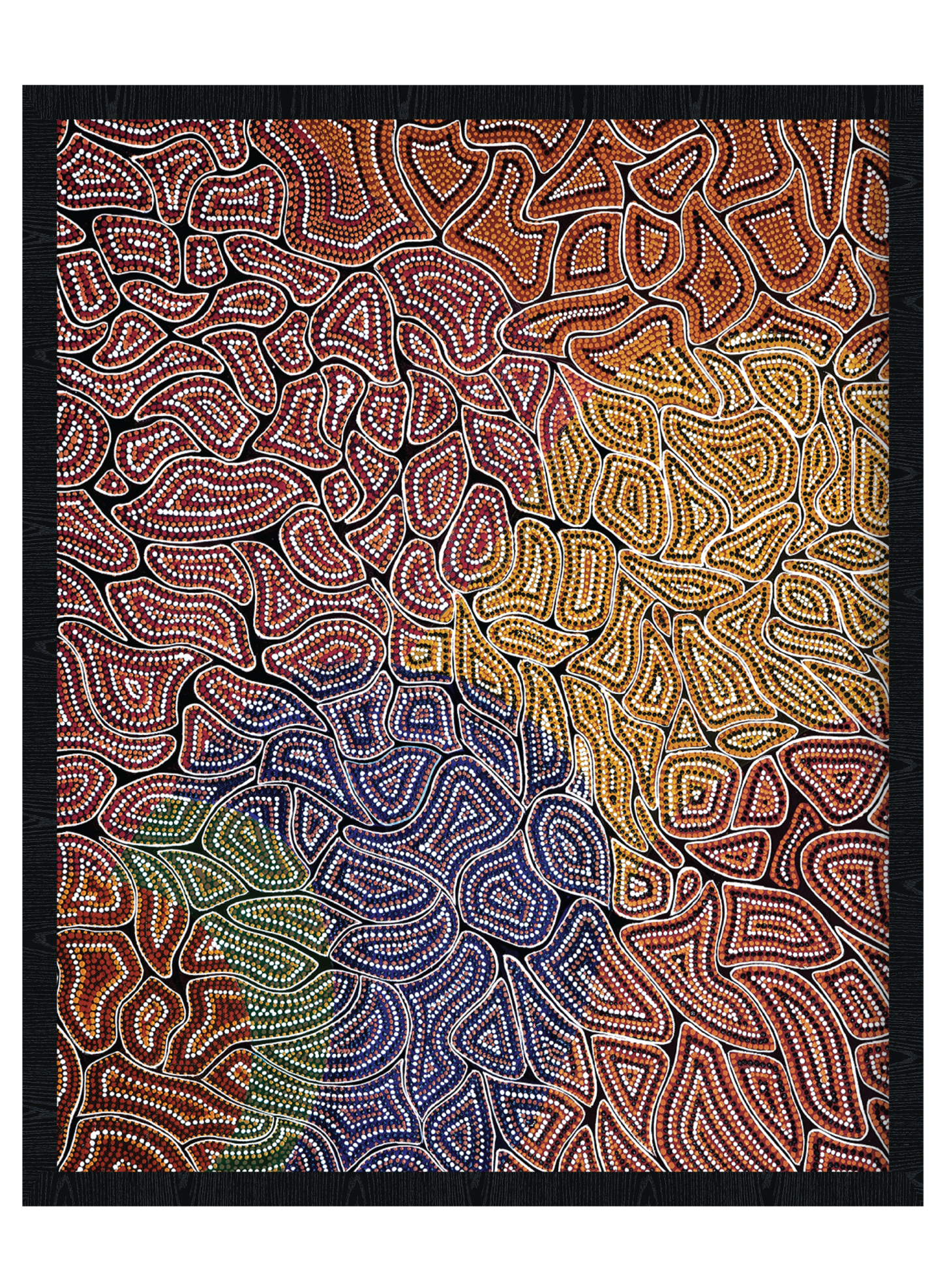 The different shades of colours in the background represent different states; but long before those states came along, we had boundaries of our own. The defined segments represent all the different tribes that existed in Australia, long before colonisation. These tribes made up the nation within itself.