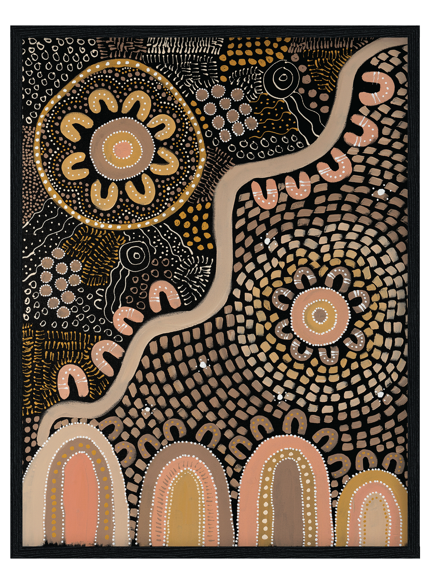 This art piece is a dedication to our Elders in honour of the 2023 NAIDOC Week theme, "For Our Elders". The main pathway in this painting is a symbol of the path that our Elders and generations before us have laid. Our Elders have paved the way for us and are constantly sharing their cultural knowledge. The mountains symbolise the struggles and hardships our Elders have been through and how they have consistently shown their strength through their triumph. The campsite at the bottom of the painting represents the past and the top left campsite is our Elders today. The circle around them represents a circle of safety, symbolising to us to always look after, respect and listen to our Elders. We would not be where we are today without our Elders. This painting is dedicated to all of the special Elders in my life who have guided me, taught me and shown me the strength culture has to pull me through even when times are hard.
