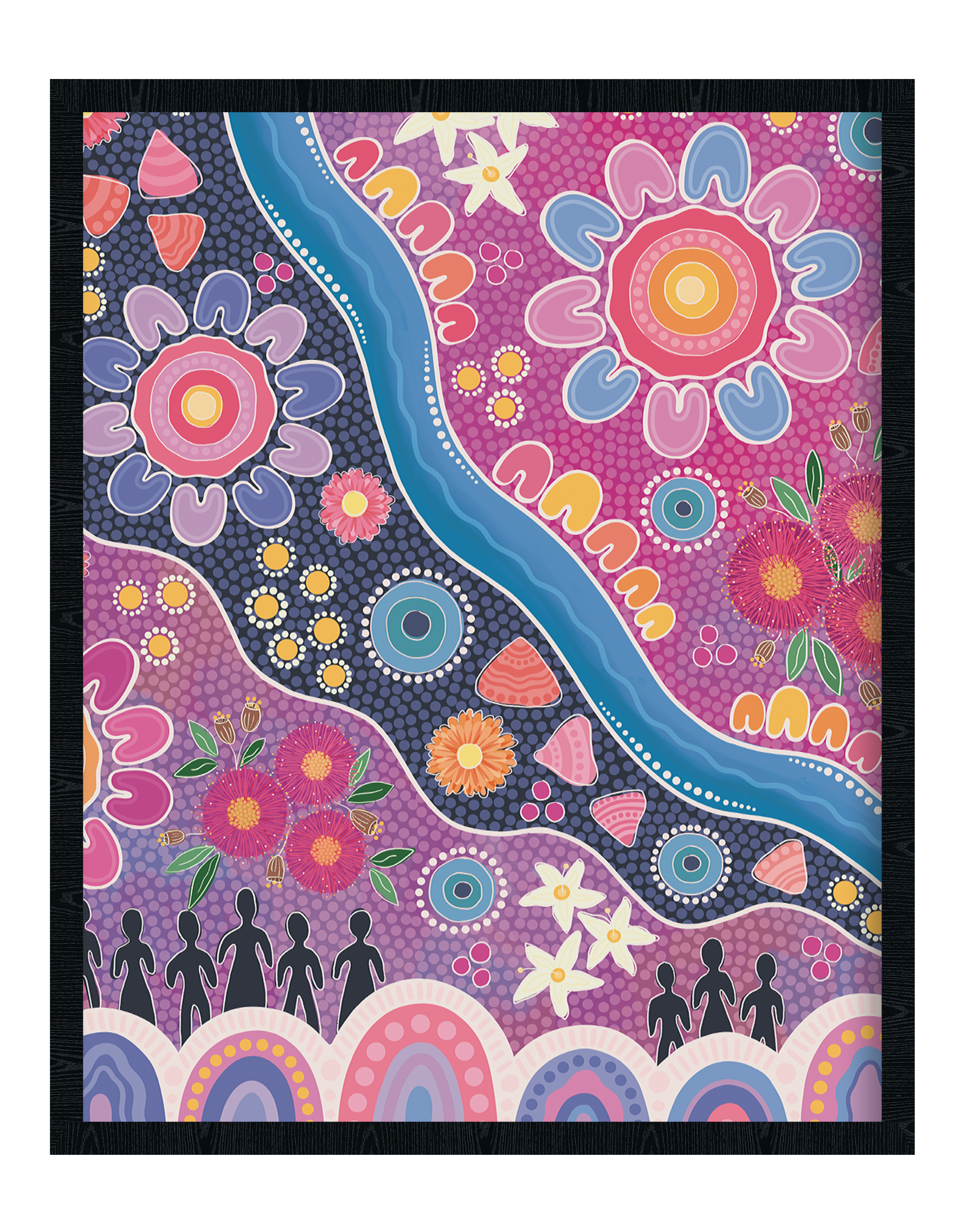 I have included bush foods and bush medicines (flowering gum, wattle, lilli pilli, lemon myrtle, pippi shells) which are sustained through the flowing river and waterholes. We live in harmony with Country, we care for Country and Country provides for us in return.