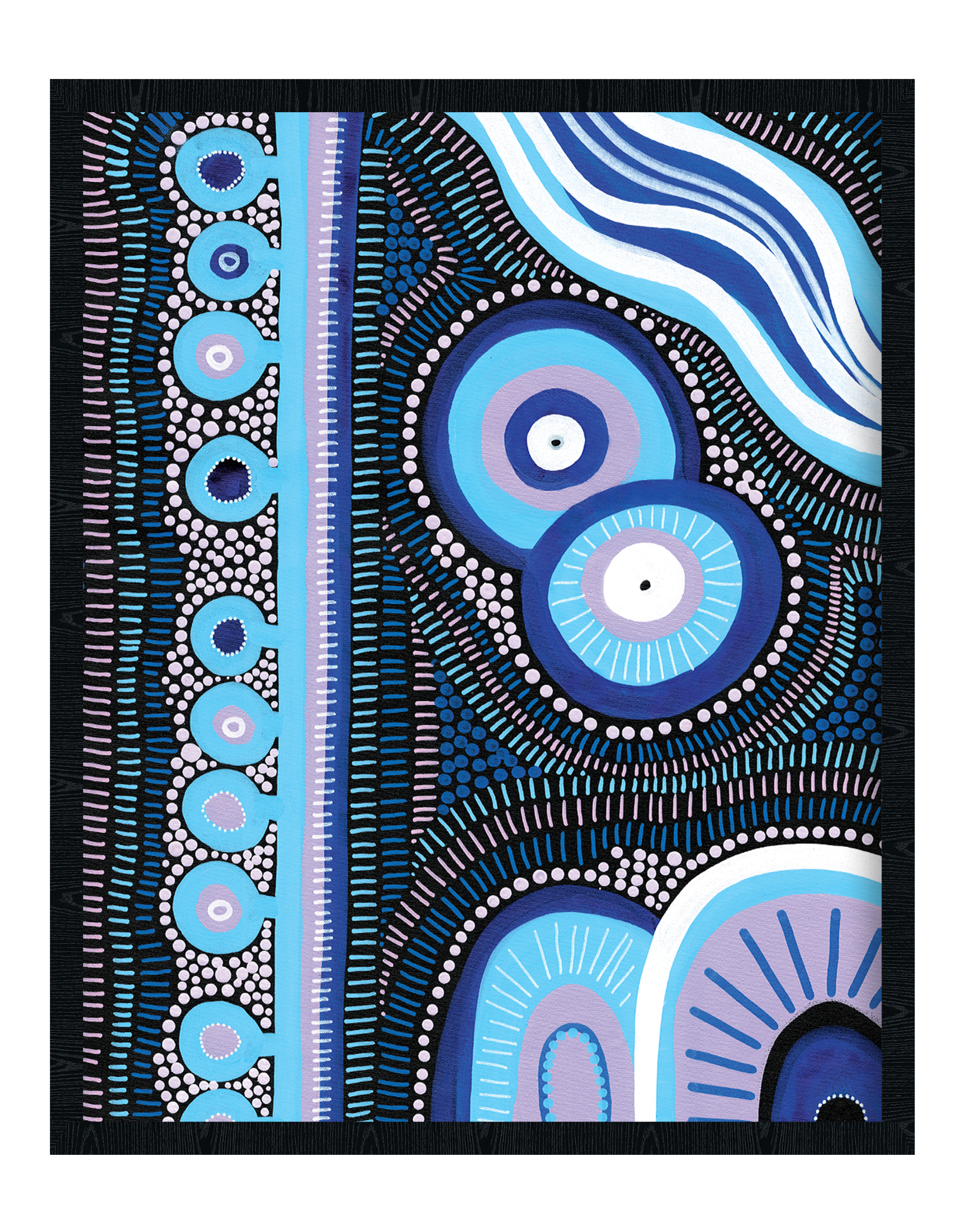 Flowing through the composition is water - a symbol of the past, of cleansing, renewal, and connection to Country. It carries the voices of Ancestors, their teachings rippling into the future, reminding us that everything we do today shapes tomorrow.
