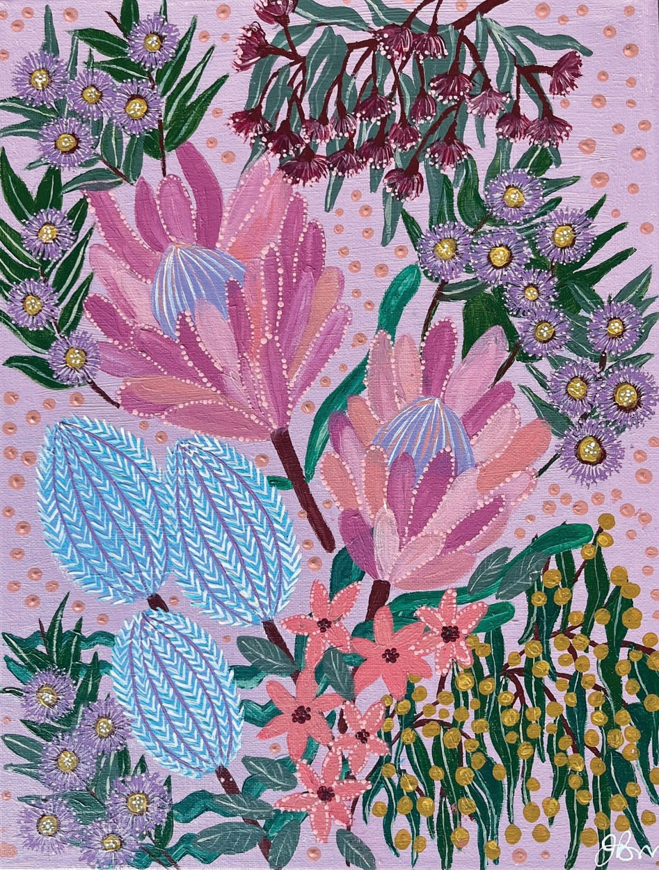 The native flora of Australia and the enduring beauty of nature. With the light pink protea and soft blue banksias, they remind us of the intricate connections that sustain life and the importance of preserving these natural treasures for future generations.