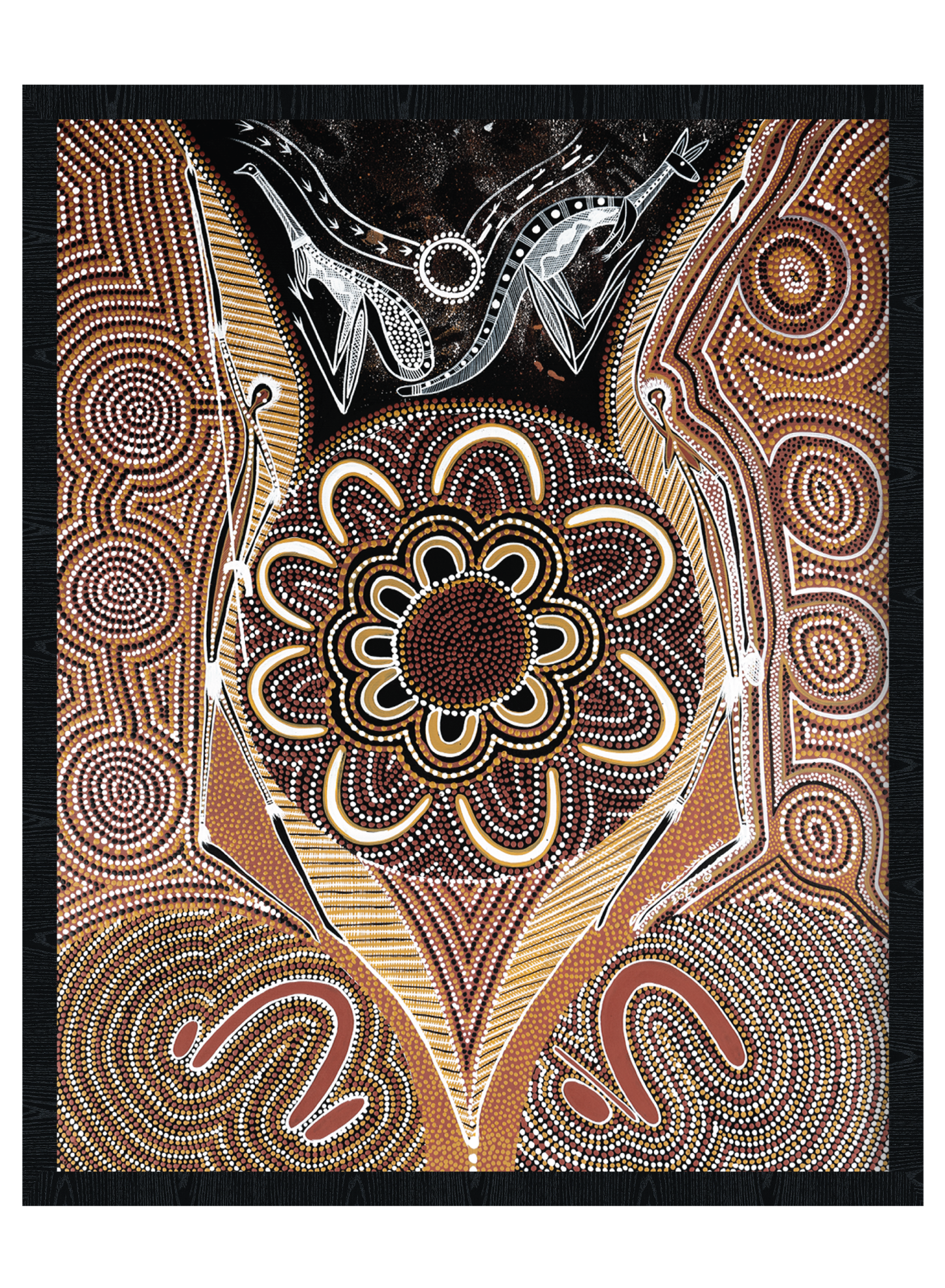 On the sides are circles representing different communities and tribes, all gathered around two tall figures, the Elders. The Elders on each side are looking over the central community: parents and grandparents who are looking over children and grandchildren. All gathered together with the Elders as the Ancestors look over everyone.” - Charlie Chambers Jnr.